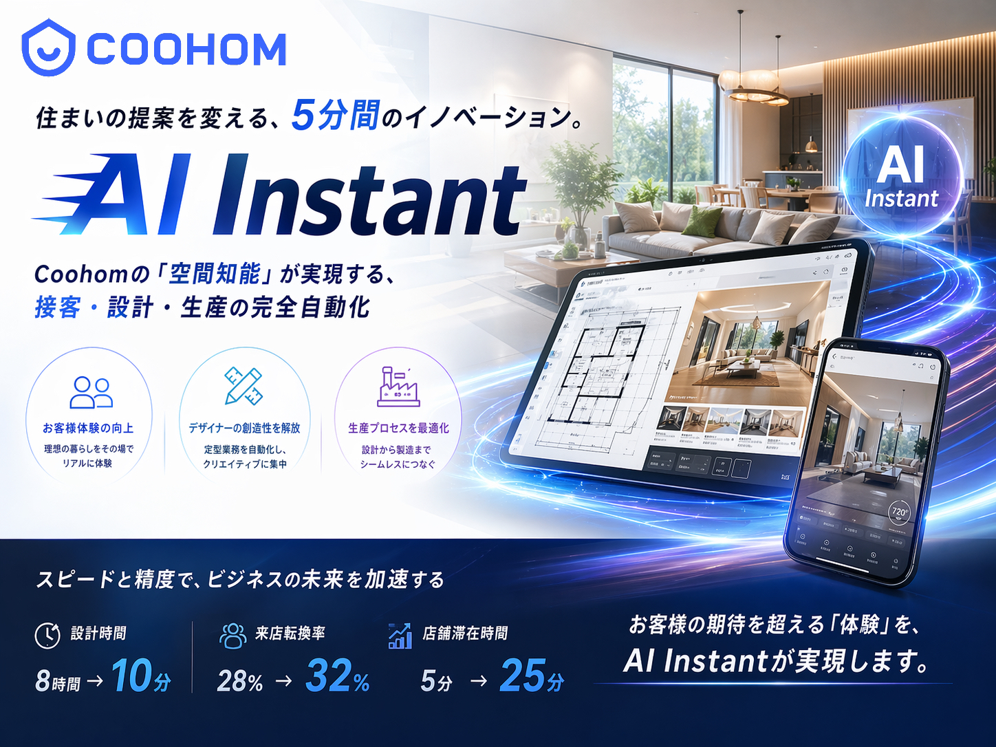 従来の家具・ホームサービスは、長い業務フロー、長期化する設計サイクル、そして高い人件費という制約に縛られてきました。AI Instantは3つのコア能力を通じてこれらの課題を解決し、パートナー店舗の成長を強力に支援します。