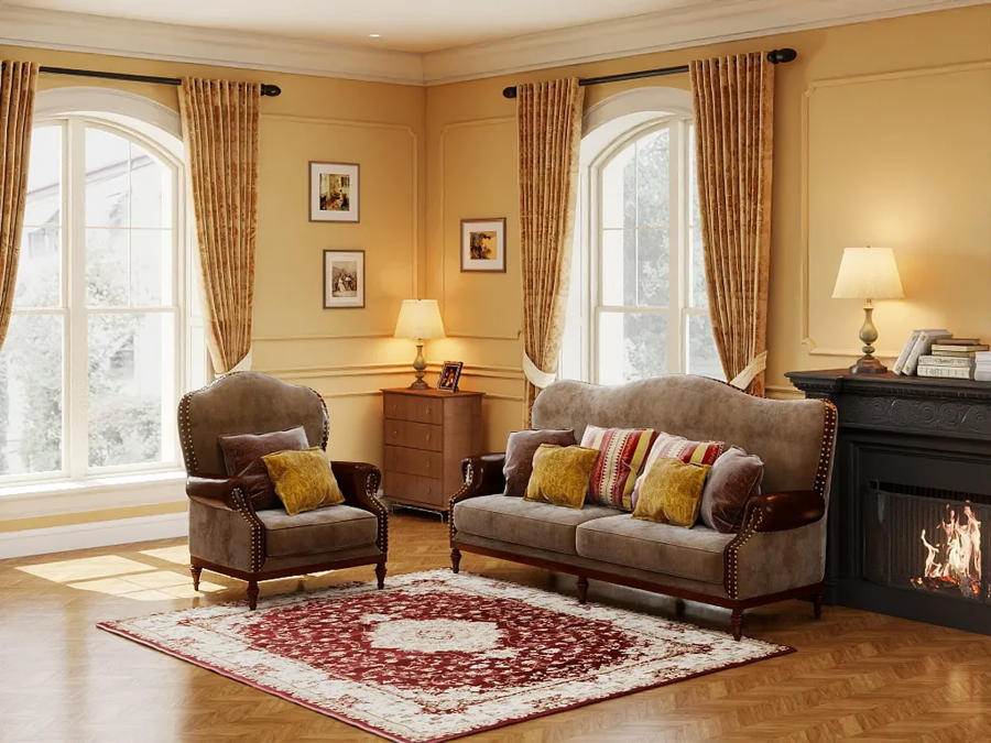 Golden sunlight filters through arched windows, spilling across the living room. The beige walls and delicately patterned light-brown curtains lend the space a quiet grace.