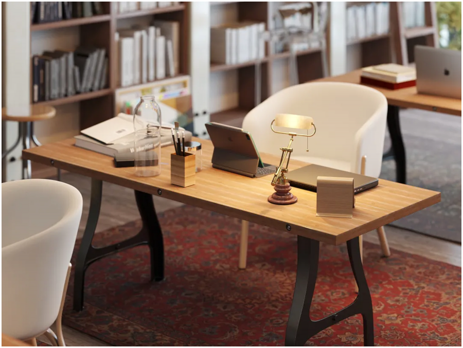 The wooden desk, rich with natural grain, rests on black metal legs—a balance of simplicity and strength. A desk lamp casts a warm amber glow across a laptop, books, and neatly arranged stationery, inviting deep focus.