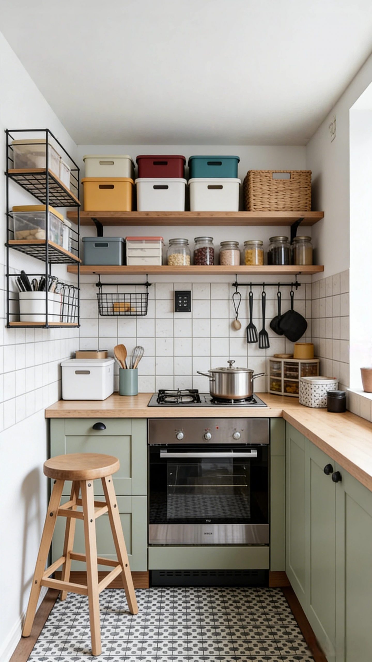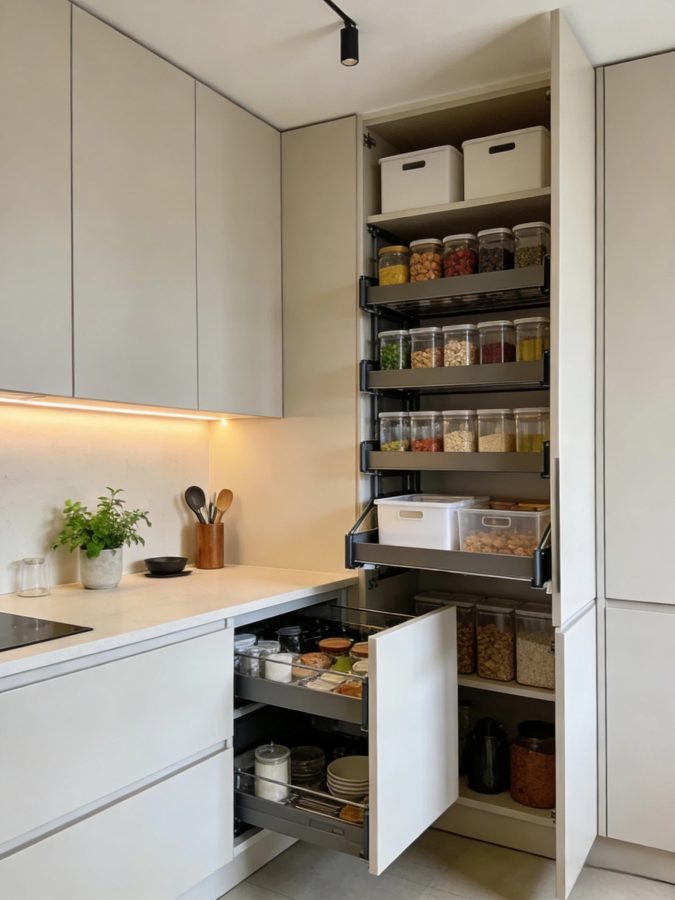Inside the cabinet, you can add a pull-out spice rack or a multi-level storage box. Common items can be placed in easily accessible positions, while dry goods can be stored in transparent containers together. This makes the arrangement neat and also facilitates use.