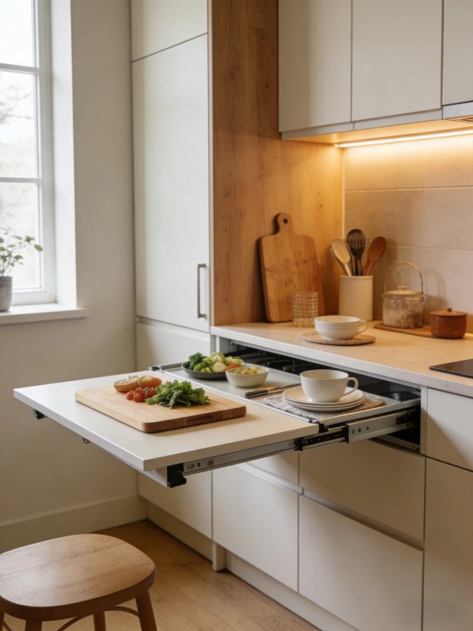 Installing a folding countertop against the wall is a very smart idea for a small kitchen. When unfolded, it serves as a preparation area, and when folded, it doesn’t take up much space. It can also be adjusted to a dining table height, suitable for eating or temporary work.
