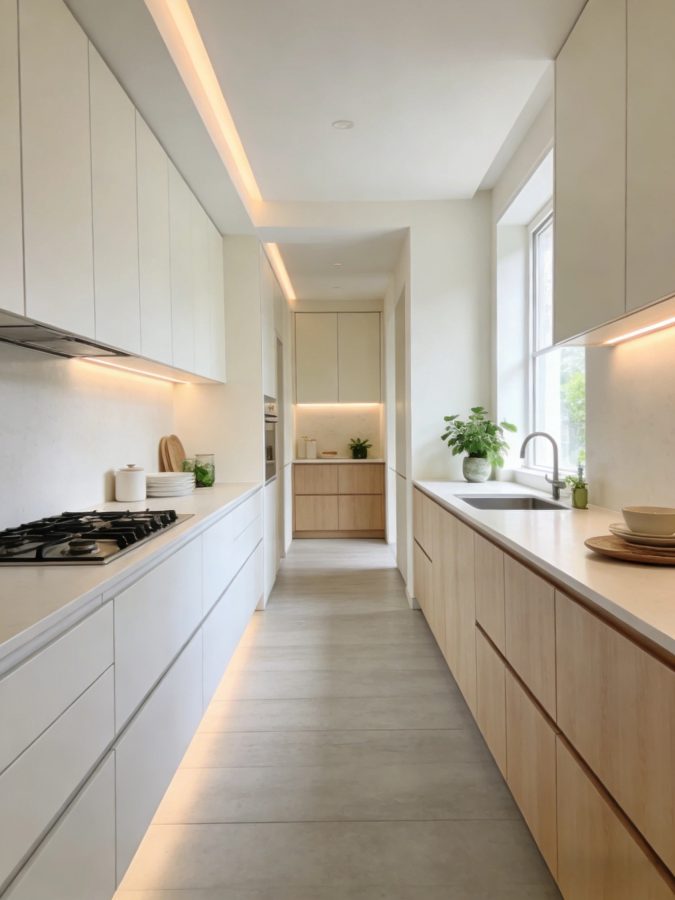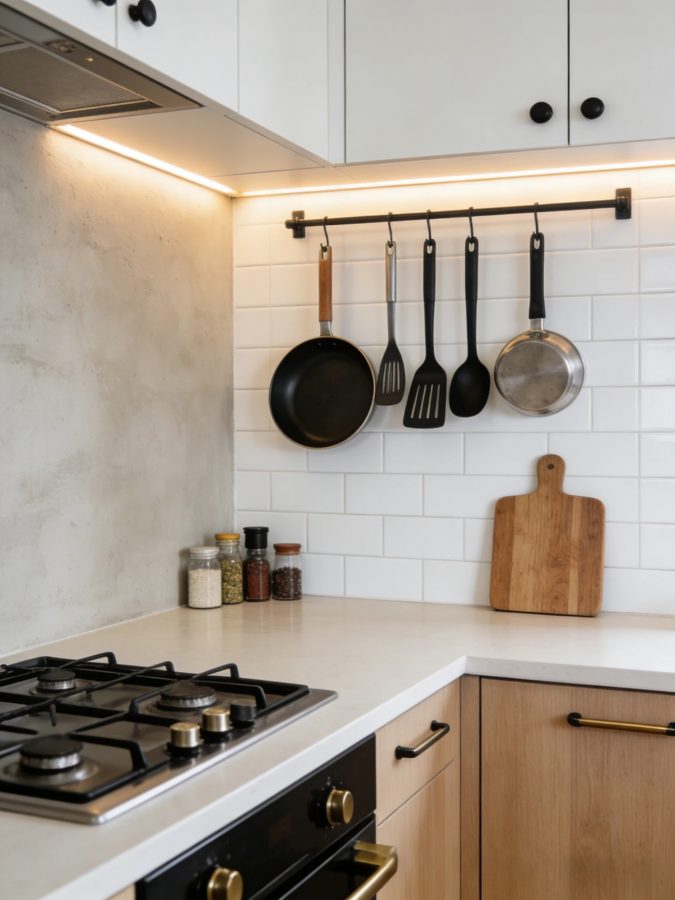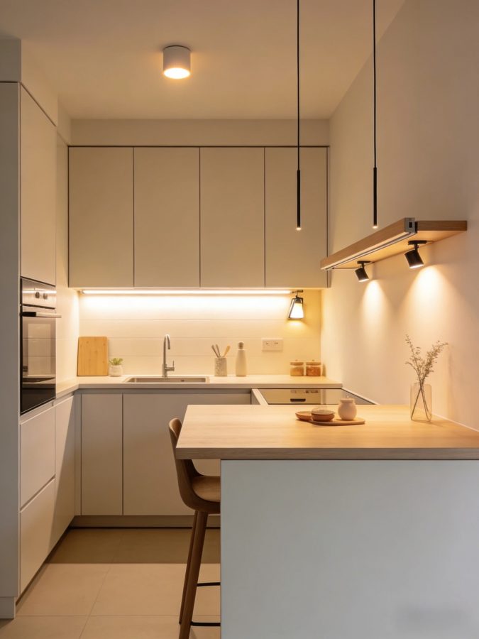 The under-cabinet light strips can be battery-powered LEDs, which are easy to install. Above the folding table, hang one or two slender pendant lamps. This not only defines the area but also doesn’t make the space look heavy. When the light sources are dispersed, the space naturally appears more spacious.